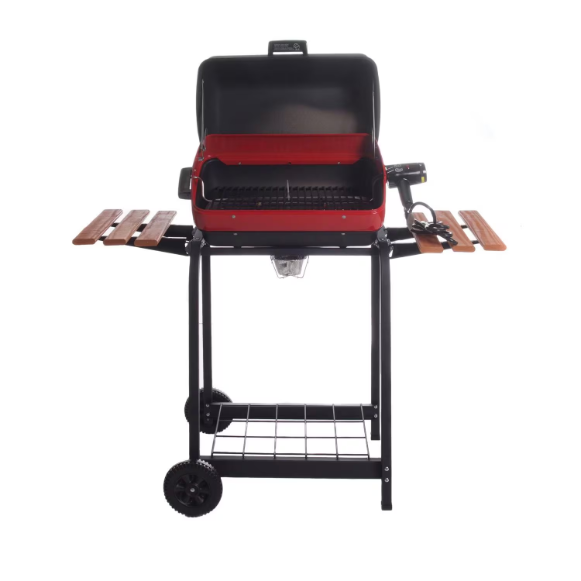 This Americana by Meco electric grill has a 1500-watt heating element that plugs into a standard household outlet. This electric grill features a thermostat control with a low-medium-high setting, a reflector pan that directs heat to the cooking surface, and a pre-assembled grill hood and bowl. The three-position cooking element provides a versatile cooking experience by allowing direct and indirect cooking. The porcelain-coated cooking grate provides 202 square inches of usable cooking surface. The sturdy steel cart features two wheels, two handy fold-away side tables made to look like real wood and a wire lower shelf for extra storage. The hood is equipped with a stay-cool wooden-like handle so there’s no need to reach for the oven mitt every time it’s time to flip your burgers. This grill is safe, simple, easy to clean, and just the right size to accommodate many spaces. This grill requires a minimum of 15 amps and standard 120-volt grounded plug. Americana by Meco electric grills are UL-listed (Canada: CUL-listed) and for outdoor BBQ use only! Manufactured in Greeneville, TN USA with Domestic & Imported components.