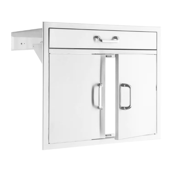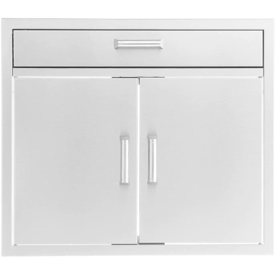 This BBQGuys Signature 30-in stainless steel double door & single drawer combo is constructed with a 20 gauge 304 stainless steel frame and number 4 brushed finish. Flush mounted for a streamlined appearance, the drawers use heavy-duty, commercial grade ball bearing glides and full length drawer tracks for easy opening and closing. An access door and drawer combo is the perfect outdoor kitchen accessory for any outdoor BBQ island, providing storage space and access to the underside of grills and side burners. BBQGuys Signature outdoor kitchen components are designed without a logo, so you can pair them with any brand of grill or outdoor kitchen appliance. Traditional and contemporary-style handles are both included, and they require installation on this door & single drawer combo. Product does not include installation hardware or instructions. Door Opening Dimensions (per door, in inches): 14 W X 18 H.