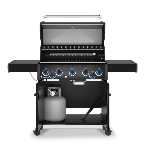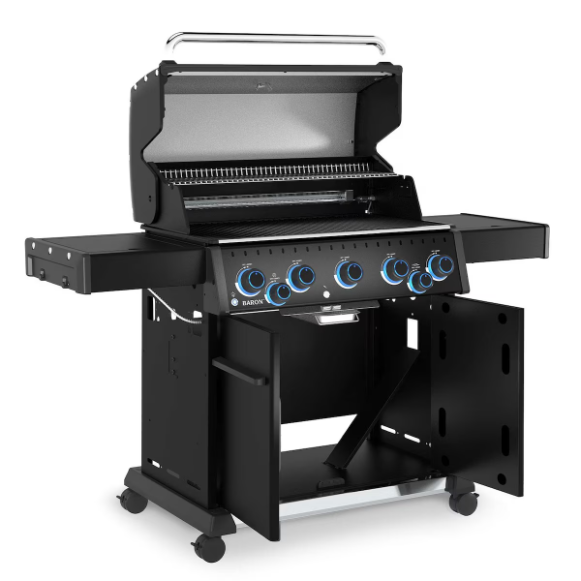 The Baron 590 Pro Shadow natural gas grill delivers power, versatility, and style for unforgettable backyard cookouts. With a 780 Sq. in. total cooking surface and 5 Dual-Tube burners producing 45,000 BTUs, it’s built for everyday grilling or weekend feasts. The 10,000 BTU side burner is perfect for sides and sauces, while the 15,000 BTU rear burner with premium rotisserie kit expands your menu and grilling capabilities. The reversible solid stainless steel V-Grids offer versatility, featuring a pointed side for perfect sear marks and a V-Channel side to capture drippings and juices for continuous basting. The Flav-R-Wave cooking system delivers even heat and vaporizes juices, infusing them back into your food for unmistakable barbecue flavor. Along with the Shadow’s sleek black styling, convenience comes standard with illuminated control knobs, electronic ignition, and drop-down side shelves. This grill is built to last and is backed by a 15-year top-to-bottom warranty.