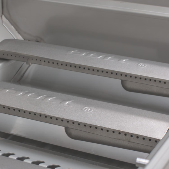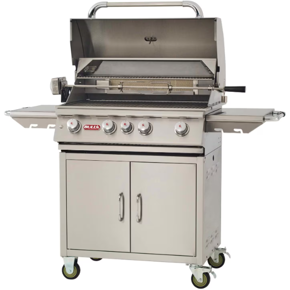 Nothing stands up to the affordable quality of a Bull BBQ grill. Constructed of 14 gauge, 304 stainless steel, this grill smokes the competition for backyard BBQ quality. Four 15,000 BTU burners that push 60,000 BTUs of total cooking power on the grilling surface, with an additional 15,000 BTU infrared rotisserie backburner for really high heat. With 5 Bull sure-lite gas valves, this propane gas grill performs above and beyond most gas grills. Four cast stainless burners and an impressive 600 square inch cooking area promises grilling perfection. The heavy duty thermometer helps keep track of food temperatures so your meal is a masterpiece every time. Five heavy duty, zinc knobs make operation easy. The rotisserie and chrome plated spit & rod help to enhance your grilling options, while the 210 square inch warming rack keeps your meal heated and ready to eat. The built-in lights make it easy for you to grill into the night. A full length handle and dual-lined roll top hood makes interior access safe and easy. The grill cart is made with 14 gauge stainless steel and features 2 side shelves for extra work space and 4 durable casters for easy movement. A hose and regulator is included with this propane gas grill. All Bull grills are CSA Gas Certified.
