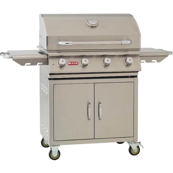Nothing stands up to the affordable quality of a Bull BBQ grill. Constructed of 304 stainless steel, the Lonestar Select propane freestanding gas grill features four welded stainless steel bar burners that push 15,000 BTUs each for a total of 60,000 BTUs. Grill your favorite steaks on the large 600 square inch cooking area or keep items warm on the 210 square inch warming rack for a total of 810 square inches of cooking space. Lighting your grill is easy with the four heavy duty, push-turn knobs with Piezo electronic ignition. The double-walled hood keeps the heat inside the grill and is constructed from a single piece of stainless steel for durability. Stainless steel cooking grates add to the quality construction for an affordable grill that is sure to last. Two internal lights help with visibility and with the heavy-duty thermometer, you are able to cook food perfectly every time. The side shelves make prep work easy and allow you to hang towels nearby, while the cart provides storage for propane tanks, tools and accessories. Easily move the cart around with the locking casters. A hose and regulator is included with this propane gas grill. All Bull grills are CSA Gas Certified.
