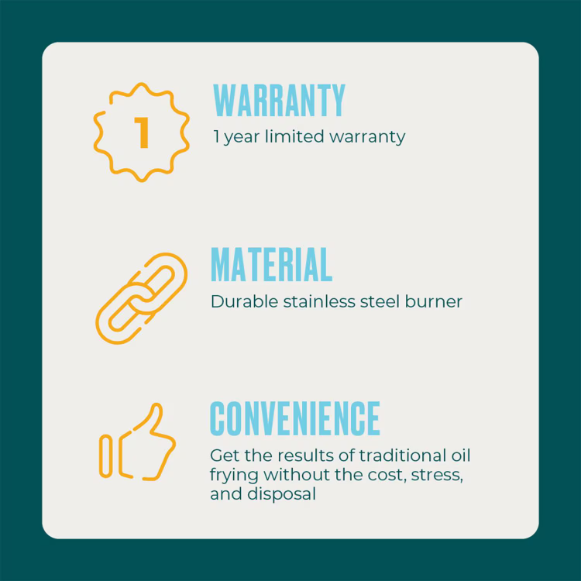 • SAFER: No hot oil means safer frying, less money spent and no stress about disposal
