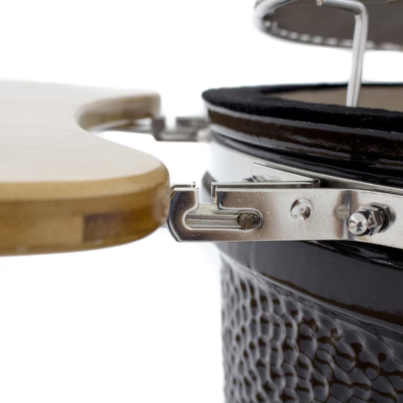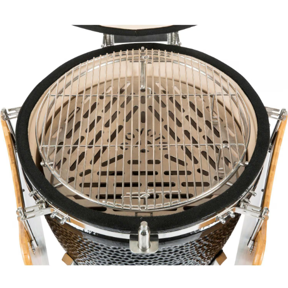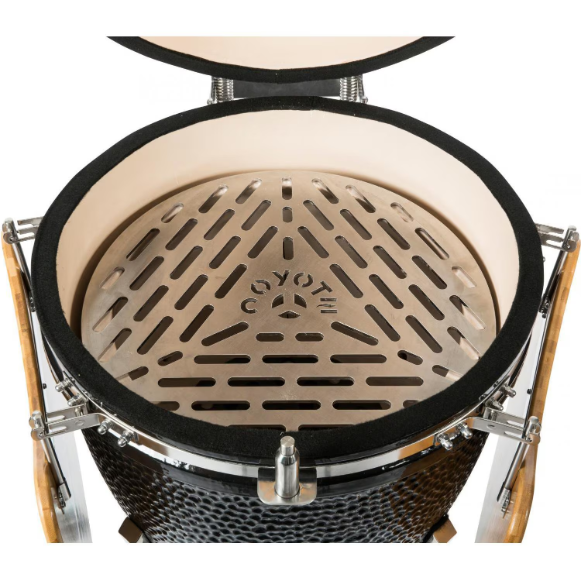 Designed for outdoor cooking enthusiasts who appreciate the flavor of charcoal grilling, the Asado grill from Coyote is a kamado-style grill that can grill, smoke or sear with ease. This grill is constructed from high grade ceramics which offer excellent heat retention, allowing you to cook at consistent temperatures for hours on end. The Asado grill offers 254 square inches of cooking area on a stainless steel grate. A dual-vent airflow system allows for precise control of cooking temperatures that can range from a smoking low, to a steak-searing high, maintaining temperatures for hours and requiring less fire tending than traditional smokers. Easily keep track of cooking temperatures with the integrated thermometer. This kamado grill includes a stainless steel cart with heavy-duty casters for easy mobility. Built-in folding wood side shelves allow you to keep serveware or grilling tools nearby while cooking. The Asado grill also includes an ash tool, ceramic feet for built-in installations, and touch-up paint.