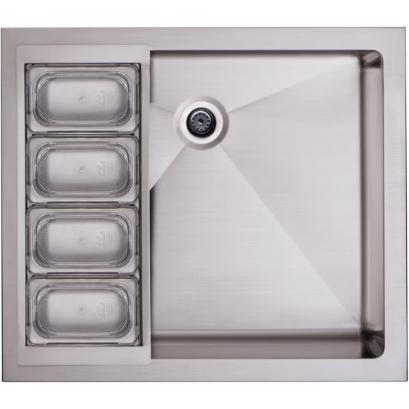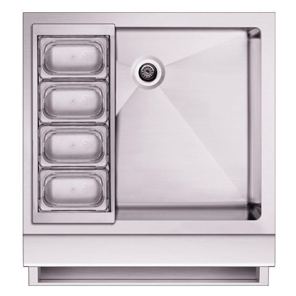 Why sacrifice the style and convenience of the indoors while cooking in your outdoor kitchen? Entertain your guests with this professionally designed beverage chiller from DCS. This 25-inch, insulated beverage chiller is double walled and holds up to 17 gallons of ice for chilling your favorite refreshments. The deep basin of the sink comfortably accommodates long bottle neck beers and wine bottles. Commercial-quality, 304 grade stainless steel construction ensures maximum durability and weather resistance. Four individual condiment containers offer food safe storage for cocktail accessories. The containers include lids and may be removed for easy cleaning or filling. The DCS BC25 has a standard sink drain and comes with a stainless steel lid to cover the chiller when not in use. The included bottle holder accessory can be attached to the front of your beverage center, allowing you to use your DCS Outdoor Beverage Chiller as a sink while holding one-liter bottles.