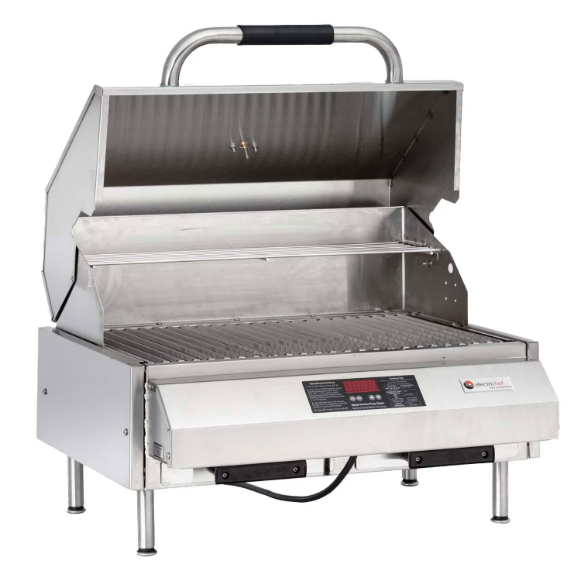 This ElectriChef 24-inch tabletop Electric Grill is perfect for apartments, homes, condominiums, and multi-family homes where open flames may not be permitted. Features include all stainless steel construction, a single control knob for easy temperature control from 150 to 600-degrees Fahrenheit, and an evenly heated 336 square-inch grilling surface. Enjoy clean electric cooking, free of messy charcoal, ashes, clogged burners, and costly fuels. A built-in 10 to 60-minute timer allows for timed cooking, and works as an automatic shutoff for safety. The removable stainless steel cooking grids and large grease trays are dishwasher safe, making cleanup a breeze. Add on an optional rotisserie kit and experience the added convenience of electric roasting! Already fully-assembled, this ElectriChef grill requires a 208/220-volt AC 20-amp single phase dedicated branch circuit.