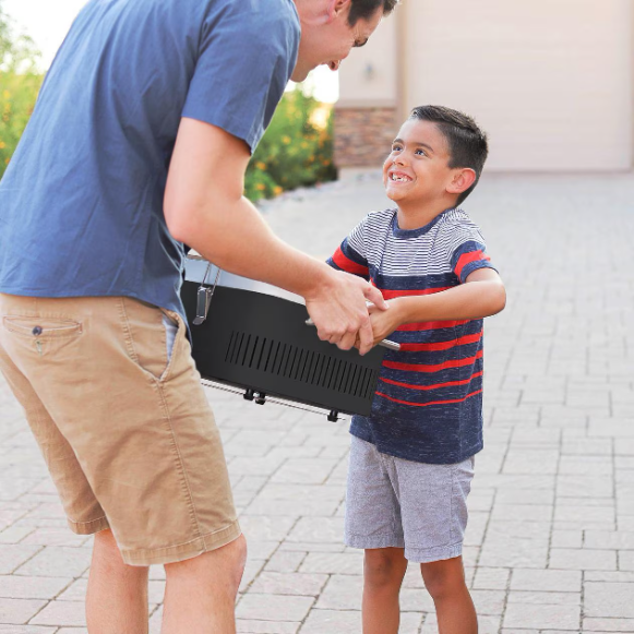 This charcoal BBQ has an integrated storage tray for accessories or food. It also includes a bamboo cutting board to prepare meat, fish, veggies & more. Two safety latches fasten all of these items into one small portable grill.