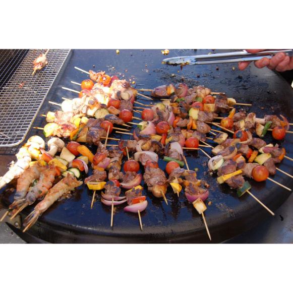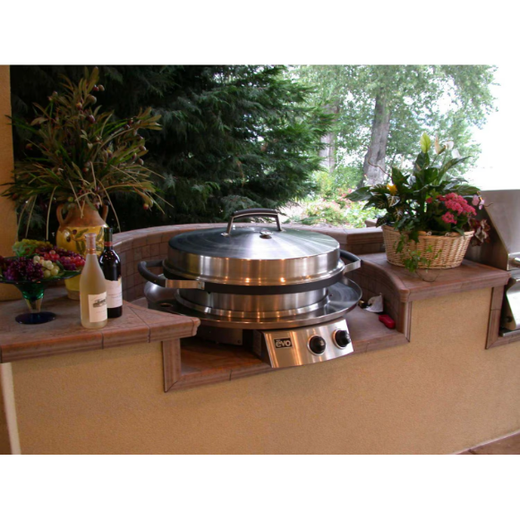 This Evo Professional Tabletop Grill is the perfect solution for entertaining your family and friends. Its the first outdoor BBQ grill that allows you to cook directly and indirectly at the same time. If you are cooking directly, you can sear, saute, grill, toast and stir-fry. Indirectly, you can boil, braise, poach or fry. And by covering the cooking surface with its stainless steel hood, the Evo Professional grill becomes a patio oven for roasting, steaming, warming or smoking. No other grill lets you be this creative outdoors. This Evo Professional Tabletop Outdoor Grill features a solid 3/16 inch oil-seasoned non-stick steel cooking surface that is 30 inches in diameter and 650 sq. Inches total, an enclosed stainless steel dual burner system ranging from 225 to 700 degrees and produces a total of 40,095 BTUs from the center to the outside for edge to edge heat control, a heavy duty stainless steel frame, housing, and control panel along with a stylish hood that has an adjustable vent. Also, this Evo Professional Tabletop Cooktop has an easy start up electronic (battery operated) spark ignition that allows you to light one or both burners simultaneously, a stainless steel drip pan around the cooking surface that catches any spillovers from falling, and a removable waste tray that is dishwasher safe. This is one of the easiest grills to clean and maintain, simply scrape and wipe down the surface and it looks brand new. From a delicious pancake and bacon breakfast to the juiciest seared steaks that you have ever tasted, this Evo Professional Tabletop grill can do it all. The Professional series comes fully assembled with a cooking surface cleaning Kit that includes a grill cleaning handle, 2 gray pads, 2 screens, 2 spatulas, and a full color cookbook with over 50 recipes.