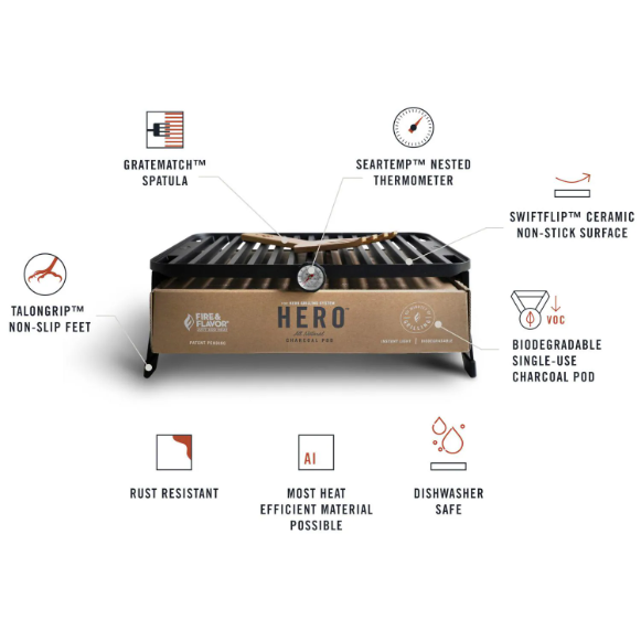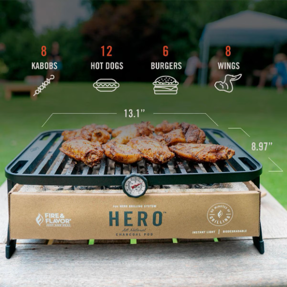 The Fire & Flavor HERO Grill is the world’s first environmentally friendly and premium portable grill that uses a biodegradable charcoal pod to make grilling clean, simple and highly portable. Thoughtful engineering combines a premium portable grill with environmentally friendly charcoal pods. The grill is lightweight, foldable to the size of standard laptop and, better yet, is dishwasher friendly. HERO single-use charcoal pods are vacuum sealed and simple to dispose of or compost after each use. The charcoal pod is earth friendly in that it is comprised of cardboard, lava stones and all-natural, instant-light charcoal briquettes.