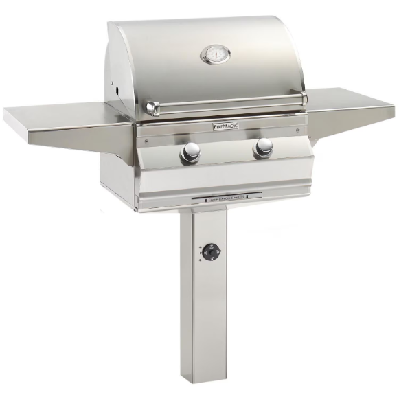 Known for crafting American-made premium grills for over 75 years, Fire Magic is dedicated to providing you with a quality outdoor cooking experience. Choice Series grills are the most affordable line that Fire Magic offers, featuring superior design and materials inside Aurora-style housing. The C430S freestanding propane gas grill is constructed of 304 stainless steel for long lasting quality, with a satin finish and comfort touch knobs on a sleek and simple control panel. Integrated into the hood is an analog thermometer, complete with an angled bezel for easier viewing. Inside, two 16-gauge stainless steel tubular burners provide 46,000 BTUs. These burners are lit by reliable push-and-turn Rapid Light ignition. Flavor grids protect the burners from grease and debris, while also spreading heat evenly to the cooking surface. The 432 sq. inch cooking surface is comprised of patented Diamond Sear cooking grids, which feature a trapezoidal shape that optimally transfers heat from the fire to your food. An adjustable warming rack adds extra space for keeping food hot, and can be moved out of the way for convenience. The disposable drip pan system makes cleanup easy. The grill is mounted to a sturdy in-ground post, perfect for permanent installation in your back yard or outdoor living space. All these features contained within a sleek and stylish facade make the Fire Magic Choice Series grill the affordable way to add a bit of luxury to your outdoor kitchen.