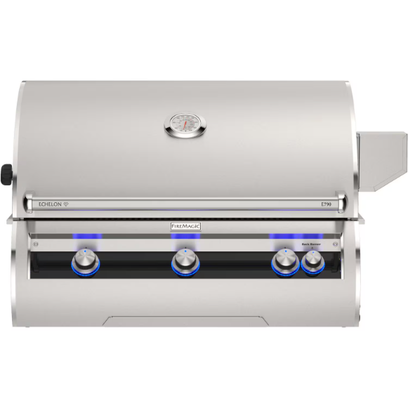 The Fire Magic Echelon boasts a state-of-the-art black glass control panel and precise heat control for grilling fish, steaks, vegetables and more with exceptional temperature accuracy. The double-walled, spring assisted hood opens 90 degrees for easier access and more efficient exhaust. Inside, this E790i grill features two cast stainless steel natural gas burners, made with 1/4-inch thick walls and precision porting, that combine for 64,000 BTUs. The third burner is a 25,000 BTU infrared searing burner, capable of reaching 1000°F. Reliable hot surface ignition always lights your burners where others might fail. Flash tubes serve as a backup. Flavor grids sit above the burners to spread heat evenly and protect the burners from debris and grease. These flavor grids have attached heat zone separators, allowing you to create independent heat zones at the surface of the grill for varied cooking options. The 792 sq. in. cooking surface consists of the patented Diamond Sear cooking grids. These grids feature a matte, non-stick surface, and a trapezoidal shape that optimally transfers heat from the burner to the wide surface of the cooking grids. The warming rack above can be adjusted and moved out of the way when not in use. In the rear of the grill is an infrared backburner for the included heavy duty rotisserie kit that produces 13,000 BTUs. For nighttime grilling, the interior of the grill is lit by three halogen lights. A large drip tray with ball bearing glides makes cleanup with the disposable drip pan system even easier than before. Solid, raised hangers line the sides and back of the grill for a seamless look when placed into an outdoor kitchen. A 120 VAC power source is required for ignition, as well as for the lighting functions. With all these premium features, the Echelon Diamond series from Fire Magic defines luxury grilling.