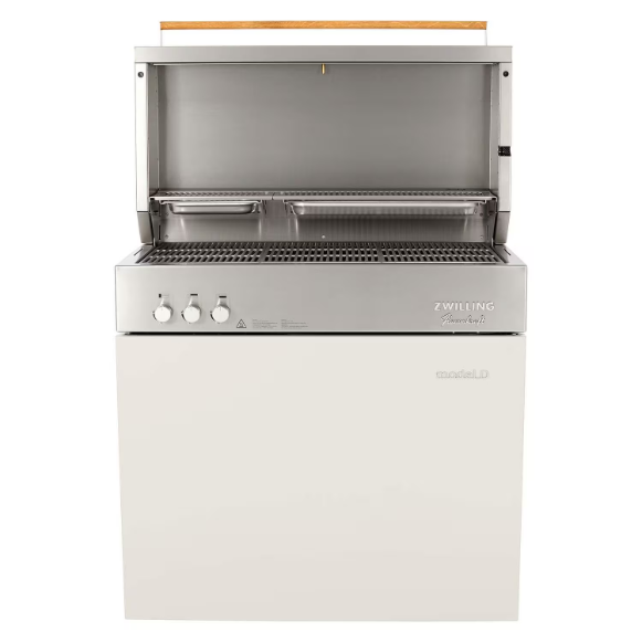 Transform the way you cook and discover countless cooking possibilities with the ZWILLING Flammkraft Model D Grill in Ivory White, featuring innovative infrared technology. An award winning design, versatile infrared burners that create individual cooking and heating zones, high quality stainless steel and expert German engineering will set a new standard for outdoor kitchens and cooking ; Discover the Model D difference. Constructed entirely of high quality stainless steel and crafted in Germany, the Model D is versatile, powerful and the perfect ingredient for any outdoor kitchen, featuring faster and hotter grill temperatures between 167 and up to 1652 degrees Fahrenheit. Form meets function. Created with convenience in mind, the Model D features a substantial, yet sophisticated design that looks good and works even harder, featuring smart storage solutions, with built in features to maximize space and an integrated wind deflector. And while the Model D stands alone, its also built in compatible for any outdoor kitchen. Get in the zone. The pioneering placement and arrangement of burners creates individual cooking and heating zones so you can grill, roast and more with direct and indirect heat (think convection oven too). The large, multipurpose surface also allows you to cook different foods at varying temperatures. And the integrated, all purpose oven trays are perfect for baking up sumptuous sides, veggies and more. Enjoy endless possibilities and meals. Make the most of your ZWILLING Flammkraft outdoor cooking experience with grilling accessories specially designed to complement the grill area. Prepare thin strips of Wagyu beef, tender scallops and crunchy vegetables on the Teppanyaki plate, whip up doughy delights with the pizza stone, saute stir frys in the wok or cook up chicken on the rotisserie skewer. Open and shut. Designed so that you can cook with the hood open or shut, the hood of the Model D is substantial, and features a double wall for complete insulation which ensures it heats up quickly and keeps an even temperature. Easy to clean. The Model D is easy to clean and maintain, with a convenient drawer for draining grease. Grates and burners can be removed and inserted quickly for easy cleanup and there s also an integrated waste bin compartment. Every Model D comes with a storage box that can also be used to soak and clean the grill parts. Color your (outdoor) world. The Model D is available in 7 timeless shades.