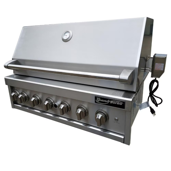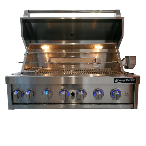 The granddaddy of them all, the Grand Turbo natural gas grill from Turbo Grills is a 7 burner, 1004 sq. inch grilling dream machine. Constructed of 304 stainless steel for durability and longevity, its rounded and polished edges give it a streamlined, modern look. Four cast stainless steel burners, two infrared searing burners, and a rear infrared rotisserie burner come through with 85,000 BTUs for cooking anything and everything you could want. The primary cooking area comprised of 10mm hexagonal stainless steel cooking grids provides 712 sq. inches of cooking space. The upper removable warming rack provides 292 sq. inches of additional space. With plenty of room for varied heat zones, any home chef will feel like a pro. The Grand Turbo uses a ceramic brick radiant heat system above the burners to evenly spread heat and keep temperatures consistent. The included rotisserie kit adds another layer of variety, as does the smoker box, which can be used to infuse delicious wood fired flavor to any food. Interior halogen lights let you grill at any time of day (or night).The control knobs are lit by temperature indicating LED lights. Blue lights indicate when the corresponding burner is off, and red light indicates when gas is flowing. A spring assisted hood adds to the accessibility and ease of use of the grill. A hood mounted temperature gauge lets you know when the fire is just right without lifting the hood. Professionally inspired and best in class in power, performance, and precision, the Grand Turbo defines premium quality grilling.