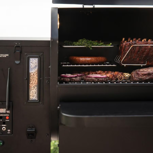 • Lid window and hopper window let you check your food and pellets without opening grill