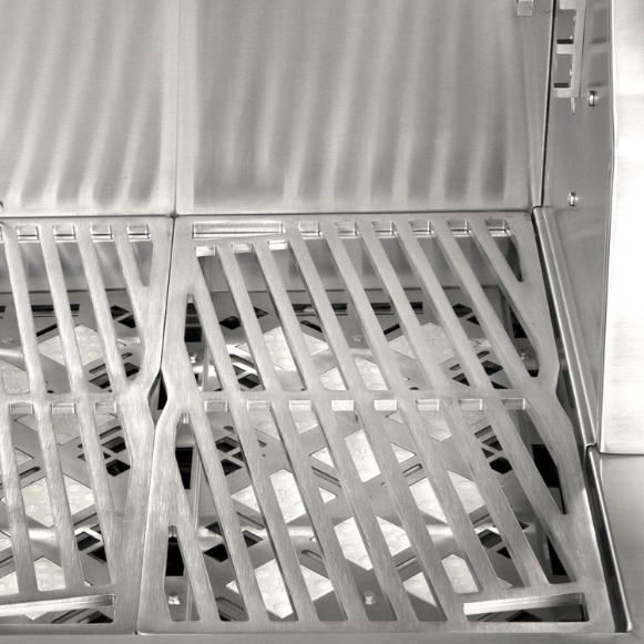 Hestan Outdoor grills combine the ultimate in precision performance & innovative design to meet the needs of every griller, from the novice to the experienced grill master. The Hestan Outdoor grill series is made in the USA with heavy-gauge welded-body construction, commercial grade end caps, Zamak die cast knobs, burner indicators & bezels and accented throughout by Hestan Marquise panels and handles. The Hestan 30-Inch Freestanding Propane Gas Grill On Tower Cart features two heavy duty 321 grade stainless steel Trellis tubular style burners that provide up to 25,000 BTUs for a total of 50,000 BTUs of high performance cooking power. Grilling surface temperatures are evenly distributed by a radiant ceramic briquette tray system. The 11,000 BTU multipurpose ceramic infrared top burner with salamander placement makes is perfect for rotisserie, broiling or finishing and includes a concealed whisper-quiet chain-driven rotisserie motor system rated for up to 50-pounds, as well as a porcelain broiling pan, rotisserie spit and forks. The laser DiamondCut 5/16-inch stainless steel cooking grates and warming rack provide 525 sq. in. primary and 189 sq. in. secondary cooking area for a total of 714 square inches of evenly-heated grilling surface. The warming rack features three vertical positions, allowing it to be used as additional cooking area or concealed storage when not in use. This grill comes packed with many convenient features that add to your grilling experience, including the easy-open, spring-assist Horizon hood, designed to stay open at any desired height. Motion-activated Stadium halogen under-hood lighting illuminates the grilling area while the LED control panel lighting keeps your controls visible for nighttime grilling and entertaining. The symmetrical flip-to-clean radiant tray and stainless steel removable drip tray make cleanup simple, and a one-push automatic ignition system makes lighting your grill a breeze. The Hestan Double Door Tower Cart offers an abundance of storage and working space with two folding side shelves and two soft-close access doors with recessed Marquise-accented panels & commercial grade handles. The cart interior features a pullout propane tank tray that can easily be converted for trash & recycling bin storage. Commercial-grade casters allow for smooth cart movement and 360-degree maneuverability. This grill features durable, powder coated stainless steel panels in the Hestan signature Grove color finish.