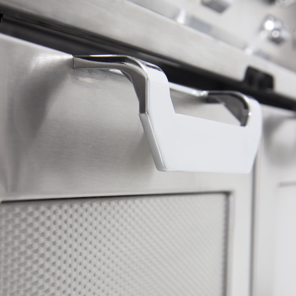 Hestan Outdoor grills combine the ultimate in precision performance & innovative design to meet the needs of every griller, from the novice to the experienced grill master. The Hestan Outdoor grill series is made in the USA with heavy-gauge welded-body construction, commercial grade end caps, Zamak die cast knobs, burner indicators & bezels and accented throughout by Hestan Marquise panels and handles. The Hestan 30-Inch Freestanding Propane Gas Grill On Tower Cart features a heavy duty 321 grade stainless steel Trellis tubular style burner that provides up to 25,000 BTUs and one high-performance variable ceramic infrared sear burner that provides up to 22,000 BTUs for a total of 47,000 BTUs of high performance cooking power. The hybrid burner configuration offers maximum cooking options. The ceramic infrared sear burner allows you to sear thick cuts of meat, sealing in precious juices. Grilling surface temperatures are evenly distributed by a radiant ceramic briquette tray system. The 11,000 BTU multipurpose ceramic infrared top burner with salamander placement makes is perfect for rotisserie, broiling or finishing and includes a concealed whisper-quiet chain-driven rotisserie motor system rated for up to 50-pounds, as well as a porcelain broiling pan, rotisserie spit and forks. The laser DiamondCut 5/16-inch stainless steel cooking grates and warming rack provide 525 sq. in. primary and 189 sq. in. secondary cooking area for a total of 714 square inches of evenly-heated grilling surface. The warming rack features three vertical positions, allowing it to be used as additional cooking area or concealed storage when not in use. This grill comes packed with many convenient features that add to your grilling experience, including the easy-open, spring-assist Horizon hood, designed to stay open at any desired height. Motion-activated Stadium halogen under-hood lighting illuminates the grilling area while the LED control panel lighting keeps your controls visible for nighttime grilling and entertaining. The symmetrical flip-to-clean radiant tray and stainless steel removable drip tray make cleanup simple, and a one-push automatic ignition system makes lighting your grill a breeze. The Hestan Double Drawer & Door Tower cart offers an abundance of storage and working space with two folding side shelves, two fully-extending soft-close drawers and a soft-close access door with recessed Marquise-accented panels & commercial grade handles. The cart interior features a pullout propane tank tray that can easily be converted for trash & recycling bin storage. Commercial-grade casters allow for smooth cart movement and 360-degree maneuverability. This grill features durable, powder coated stainless steel panels in the Hestan signature Pacific Fog color finish.