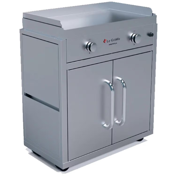 Enjoy the benefits of healthy, French-style griddle cooking with the Le Griddle natural gas griddle, built-in, countertop or freestanding use with the included cart mount. Featuring a professional-style 304 stainless steel griddle surface and components, the Le Griddle 30-inch natural gas griddle offers excellent heat distribution thanks to a 1/2-inch thick enameled cast iron sub-plate below the cooking surface. Two 304 stainless steel U-shaped gas burners rated at 18,000 BTUs combined provide even heating and can be individually controlled with separate control knobs. The easy to use electronic ignition system is powered by a single AA battery and features a safety valve and thermocouple to automatically cut off gas supply in the event of accidental flame extinction, while ventilation cutouts allow proper airflow to prevent gas buildup and overheating. Cleanup is easy with the removable griddle plate and curved grease collection tray, designed to capture oil and fat for simple disposal. The included freestanding griddle cart features durable 304 stainless steel construction and a two-door storage cabinet with a secure propane tank mount, wheels for portability, and ventilation cutouts for safety. Some assembly is required for cart-mounted use. This product does not include a propane gas regulator or hose.