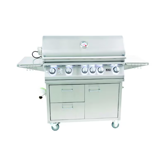 Lion demonstrates their gourmet grilling expertise with the L90000 natural gas grill. This stainless steel 40-inch BBQ grill has all the features and flare required to get your backyard barbecuing experience started. Six Lion Quick Lite valves ensure a fast, steady flame for grilling startup, and push-to-turn knob design simplifies operation. Commercial grade 304 stainless steel construction promises an unbreakable grill in your backyard. The double layer, seamless welded, stainless steel grill head with polished edges delivers durability to your grilling area. Five cast stainless steel burners push 75,000 BTUs of cooking power on the grilling surface, and a 15,000 BTU infrared rotisserie back burner adds fuel to the fire! An XL commercial temperature gauge makes monitoring your meal simple, and the two interior lights illuminate the grilling area so you can enjoy your Lion grill late into the evening. Premium solid stainless steel grilling grates resist wear and tear, and provide 802 square inches of grilling space. Experience the benefits of a grilling gourmet package with the included rotisserie, cover, smoker box, griddle and griddle remover. This grill comes on the Lion L90000 cart with four heavy duty casters, two locking casters and two non-locking casters and features a towel rack on one side for easy access to paper towels while cooking, and a bottle opener on the other side. Also featured on the cart are two side shelves with rails and tool hooks, so you can keep your grilling utensils within easy reach, and a single front access door and two pull out drawers for extra storage under the grill.