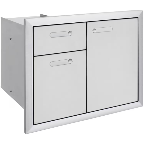 Lynx Ventana Collection offers the finest storage solutions with a sleek, contemporary look for the outdoor kitchen. This 30-inch door and drawer storage unit has two 25-inch deep illuminated drawers. Both the door has a soft close hinge and the drawers feature soft close slides to prevent slamming and offer safety for little fingers. The framing is sealed to help keep out dust and water, and make the unit easier to clean. The flush mounted handles are reversible to allow for custom installation. Door kits are available for bottle and towel storage. The storage door and drawer unit may require a Lynx Accessory Switch (LASK) for power.