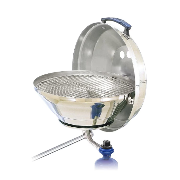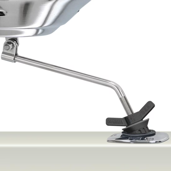 The Magma Original Size Marine Kettle Gas Grill is constructed with 304, 18-8 mirror-polished stainless steel with marine grade qualities that add superior corrosion resistance and is less prone to rust. Designed for the grill master on the open water, the Kettle is ideal for grilling up some burgers or dogs with your pals or, if you are feeling fancy, even searing a steak. Worried about blow-outs on the windy seas? Magma has you covered! The turbo venturi tube and stainless steel burner feature a windproof design that prevents blow outs. The tube also swivels, which adjusts the control valve to whatever setting you need. The Marine Kettle also features a balanced hinged lid which could double as a windshield when things get gusty. The included PowR GripFish rod holder mount includes 304, 18-8 stainless steel and cast 356 hard anodized aluminum construction. Easily mount the grill in any direction. Quickly disconnect without any tools when ready to store away. Designed with quality and durability in mind, the original Marine Kettle helps you combine your loves of fresh BBQ and sunny days above the waves.