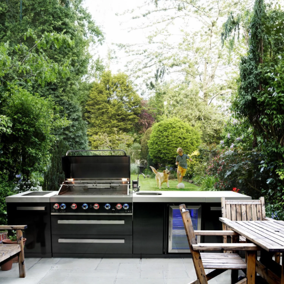 - Black stainless steel 6-burner grill & 2.6 Cu. Ft. refrigerator ideal for entertaining