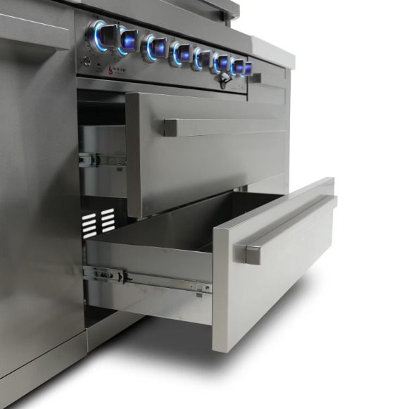 The heart of the Mont Alpi Original Series outdoor kitchen island is the 6-burner stainless steel grill, providing a vast cooking surface for grilling all your favorites. Whether you’re preparing steaks, burgers, or veggies, the even heat distribution ensures excellent results every time. Built-in blue LED control knobs turn red when in use, offering a stylish and functional design that makes nighttime grilling safer.