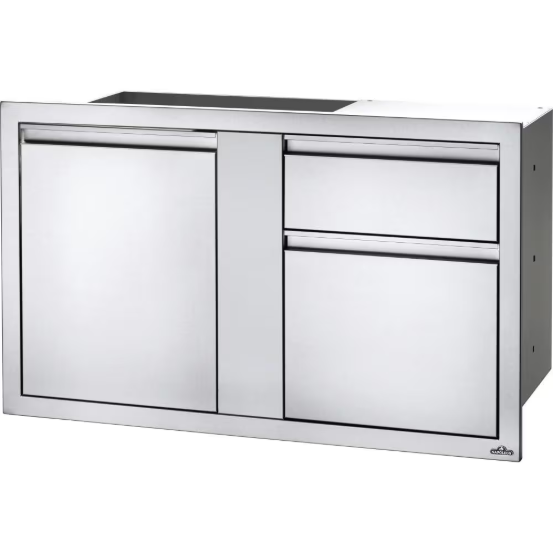 Customize your outdoor grill island with Napoleon built-in components. Measuring 42 inches wide by 24 inches high, this stylish stainless steel large single door and double drawer combo gives you the added storage that every outdoor kitchen needs. Anodized aluminum handles pair with soft closing hardware to provide durability and comfort. The seamless trim provides flexible and flawless installation. You know you can expect quality when Napoleon has their named stamped subtly into the side of this sliding drawer. These built-in storage components are ideal for any outdoor kitchen.