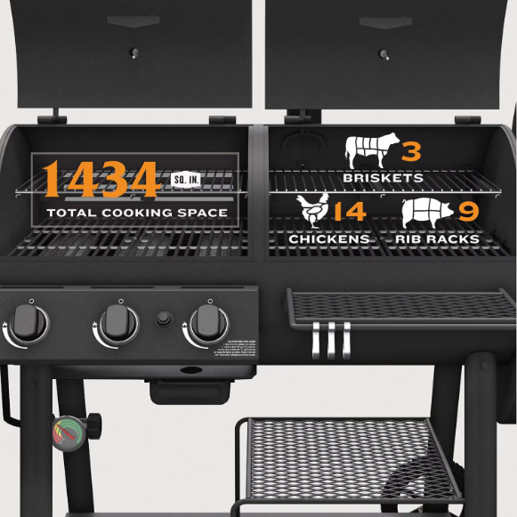 Redesigned to improve your smoking & grilling experience, this upgraded Canyon Combo DLX has additional cooking grates, pivoting cool touch handles, an easy-access ash pan and rubber treaded wheels. There are tool hooks, a charcoal basket, a robust staging shelf and a fuel gauge.