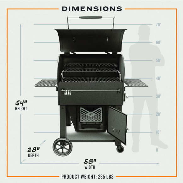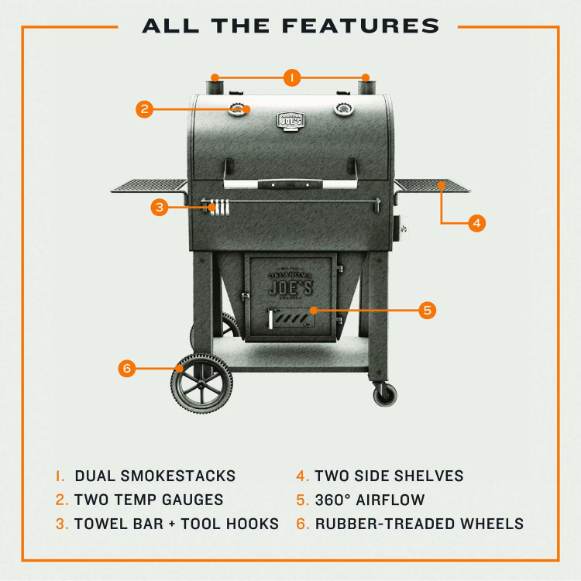 - Two temperature gauges to monitor temperatures & dampers on the smoker & firebox provide 360 degrees airflow to evenly fuel fire
