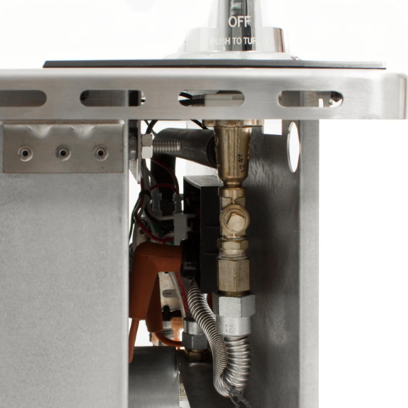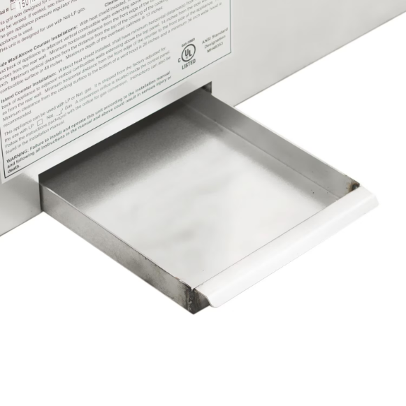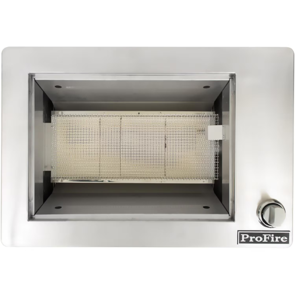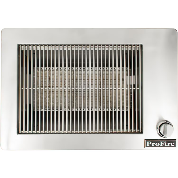 Bring the Outdoor Flavor inside with ProFire. This grill must be used in conjunction with a suitable vent hood (600 CFM for an internal blower and 900 CFM for an external blower) and is only approved for use in the USA. See the instruction manual for complete installation instructions. The Indoor Grill features one infrared burner and a High Tech ignition system that includes a built-in safety shut off. Clearance: Zero clearance to combustibles below cooking surface. The maximum height above the cooking surface is 30 inches to the bottom of the hood. The vent hood should overlap the cooking surface a minimum of 3 inches on each side. This propane grill comes with a conversion kit including orifices to convert it to natural gas if desired.