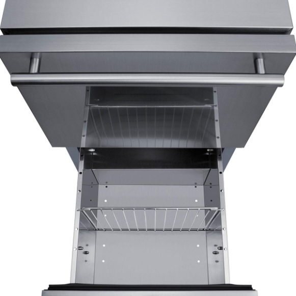 Sized at just 32 high, the Summit ADRD18OS is a two-drawer outdoor all-refrigerator that can be built-in under ADA compliant counters or used freestanding. Complete stainless steel construction inside and out is designed to hold up to the elements in style. Soft close glides allow you to gently close each drawer with a light touch. The drawers can also be customized with overlay panels to match or accent existing cabinetry design, while the stainless steel kick plate and stylish handles complete the look. This unit includes a right-angle cord for a better fit. The sealed rear offers additional protection from outdoor elements. Frost-free operation ensures minimum user maintenance inside the 3.4 cu ft. interior. Each drawer includes a divider to make it easier to separate and organize your storage, with attractive and efficient LED lighting to illuminate the interior. Intuitive digital controls display a temperature readout switchable from Fahrenheit to Celsius to best suit your preference. High/low temperature alarms audibly warn if the interior goes out of the recommended range. Additional features include an open drawer alarm, child lock to secure the controls, sabbath mode for optional observance, and Eco-mode for energy savings.