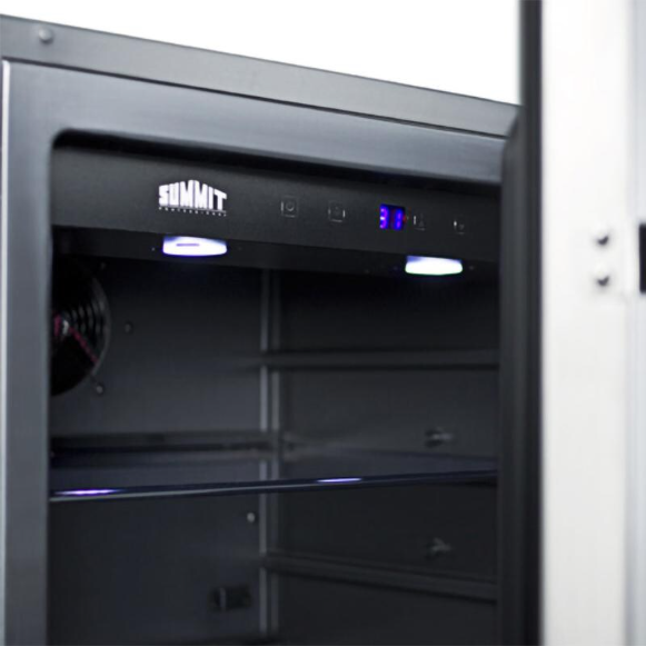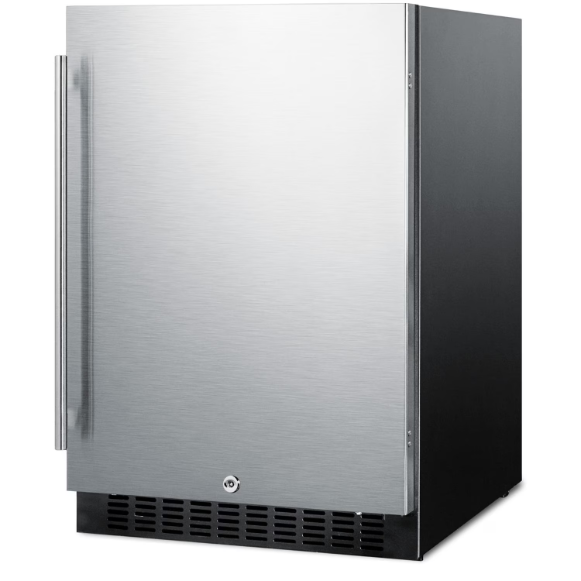 With innovative design and superior construction, Summit refrigeration products are finely crafted inside and out. The 24-inch wide commercially approved outdoor refrigerator has a stainless steel reversible door that locks, three adjustable glass shelves, a scalloped bottom for holding wine and champagne bottles, digital thermostat, and interior light. This 4. 6 cubic foot refrigerator features a frost-free operation to reduce maintenance on the refrigerator. The features continue with the professional style handle, black kick plate, sealed back, gentle LED lighting that can be turned on or off with a switch and flat door liner. The front-venting and fully finished stainless steel cabinet allows the 100 percent CFC free refrigerator to be built-in or freestanding.