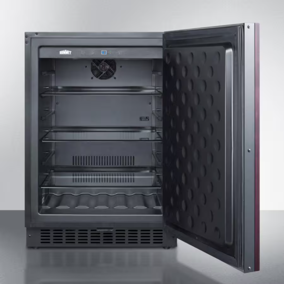 With innovative design and superior construction, Summit refrigeration products are finely crafted inside and out. The panel ready 24-inch wide commercially approved outdoor refrigerator has a stainless steel right hinge door that locks, three adjustable glass shelves, a scalloped bottom for holding wine and champagne bottles, digital thermostat, and interior light. This 4. 6 cubic foot refrigerator features a frost-free operation to reduce maintenance on the refrigerator. The features continue with the black kick plate, sealed back, gentle LED lighting that can be turned on or off with a switch and flat door liner. The front-venting and fully finished cabinet allows the 100 percent CFC free refrigerator to be built-in or freestanding. This panel ready refrigerator does not include a handle. This unit is National Sanitation Foundation listed to NSF-7 standards for commercial use.