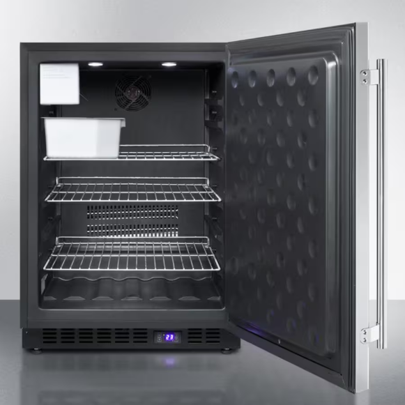 With innovative design and superior construction, Summit refrigeration products are finely crafted inside and out. The 24-inch wide commercially approved outdoor freezer has a stainless steel reversible door that locks, three adjustable chrome shelves, digital thermostat, and interior light. This 4.72 cubic foot freezer features a frost-free operation for easier maintenance. The features continue with the factory installed ice maker, full length handle, black kick plate, sealed back, gentle LED lighting that can be turned on or off with a switch and flat door liner. The front-venting and fully finished cabinet allows the 100 percent CFC free freezer to be built-in or freestanding. This unit is National Sanitation Foundation listed to NSF-7 standards for commercial use.