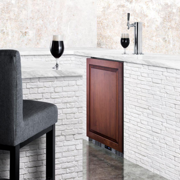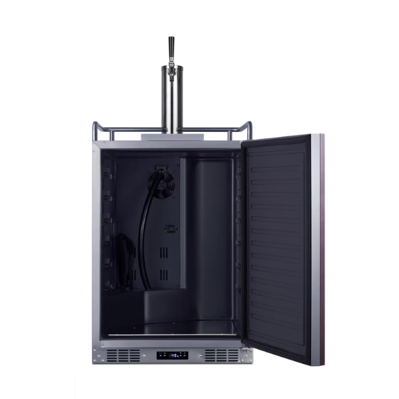 Summit manufactures a complete line of versatile kegerators capable of built-in installation in indoor or outdoor home settings. The SBC682PNR is a full-sized beer dispenser approved for both residential or commercial use. Sized at just 24 inches wide, it features a front-breathing system for built-in installation and a fully-finished cabinet that also allows freestanding use, with an included caster set for optional mobility. The exterior features 304 grade stainless steel construction for safe, weatherproof use in the outdoors. The door is designed to accept overlay panels (sized at 29 3/4 H x 23 5/16 W at a 3/4 inch thickness) to allow you to create a custom look to best suit your own kitchen design. This unit ships with a right hand door swing. For a left hand version, add option LHDHinge. Additional features include a removable two-piece stainless steel drip tray to collect spills and a chrome guard rail to help keep glasses and mugs in place. This unit has a sealed rear for added protection from the elements. Inside, the 5.6 cu. ft. interior can accommodate a full half or quarter keg, or up to three Cornelius or sixth barrel kegs. We include a complete commercial grade tap kit for dispensing your favorite beer, including a Sankey tap system and single tap draft tower, along with a CO2 tank and regulator. A tap cool system keeps your beer cold as it goes through your tower, and a Velcro strap holds the tank in place. The floor is constructed from stainless steel for added protection when loading and removing kegs. Two chrome shelves, with six placement options, allow the kegerator to also function as a beverage refrigerator. A digital thermostat makes it easy to manage the wide range temperature, while the external digital display has a readout in Celsius or Fahrenheit. Automatic defrost operation ensures minimal user maintenance. The Memory IC function recovers the units last settings in the case of a power outage or disruption. With its solid construction, user-friendly features, and attractive design, the SBC682PNR is the perfect beer dispenser for indoor or outdoor kitchens. Additional choices are available with alternate tapping options, including choices to dispense wine and coffee.