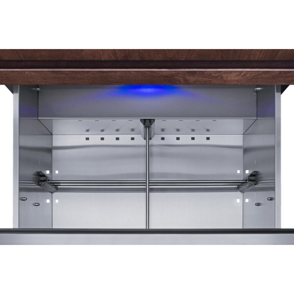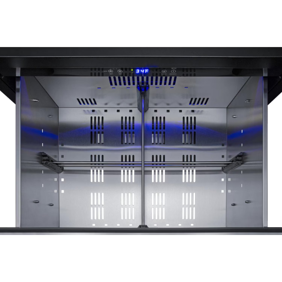 Summit is expanding its popular lineup of built-in undercounter refrigeration with new luxury choices for 27 inch wide spaces in residential or commercial kitchen indoor and outdoor spaces. SPR275OS2DPNR is a panel-ready 2-drawer all-refrigerator sized just under 27 inches wide and under 24 inches deep for an easy fit under the counter in any kitchen with limited depth. The drawer fronts are designed to accept overlay panels (sized at 26.77 W x 13.78 H at a 3/4-inch thickness) to allow you to create a custom look that best suits your kitchen design. We include a set of handles for optional use, and the drawer fronts are fully finished in stainless steel if you prefer that style. The front-breathing design allows built-in installation, while the fully finished black cabinet also enables freestanding use. The sealed back and right angle plug help to ensure an easy fit. With nearly 5 cu.ft. of interior capacity, the SPR275OS2DPNR is perfect for keeping a variety of items in easy reach. Each drawer includes a removable divider that lets you create four adjustable sections inside to help organize the interior. The intuitive digital control panel features a wide range from 34 to 65 degrees Fahrenheit, allowing you to adjust your storage conditions for standard food items or beverages better held at warmer temperature. The temperature display can be switched from Fahrenheit to Celsius for added convenience. Both drawers feature LED lighting in a striking blue finish for elegant illumination. Frost-free operation minimizes maintenance and internal fans help to maintain an evenly cooled interior. Additional features include open drawer alarms, a child lock to prevent changes to the controls, an eco mode setting, and a 96 hour sabbath mode to disable certain features for periods of observance. The SPR275OS2DPNR features weatherproof construction for safe installation in outdoor kitchens. It is ETL-S listed to NSF-7 commercial standards and also complies with residential regulations for home use.