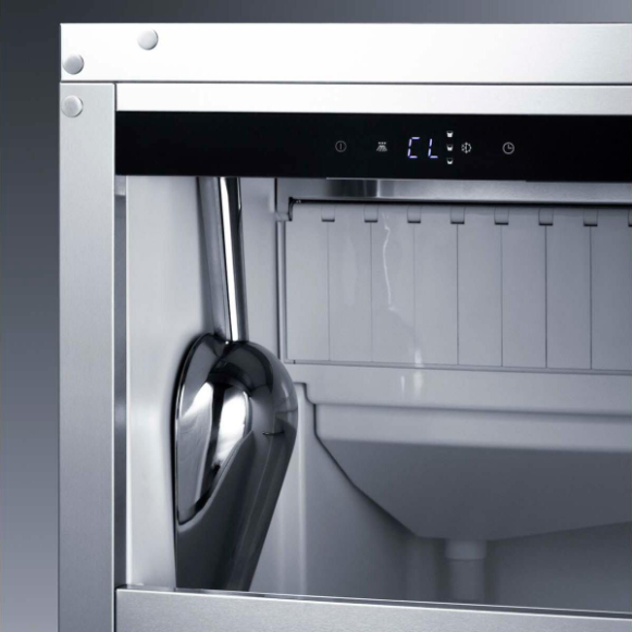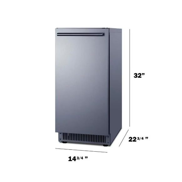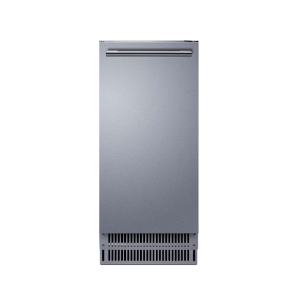 Summit brings proper convenience and streamlined luxury outdoors with their built-in undercounter weatherproof icemakers sized for residential and commercial spaces. Model BIM63OSADALHD is a 15 wide outdoor icemaker featuring an attractive and durable stainless steel exterior designed to hold up to the outdoor elements. This icemaker is sized at just 32 high to fit under lower ADA compliant counters. The legs can be raised to 34 1/4 for taller spaces. We include a sliding kickplate that helps fill the extra space if the unit is raised. The front-breathing design allows built-in installation under counters, the fully finished stainless steel cabinet allows freestanding use, and the sealed back and right-angle cord help ensure an easy fit. This icemaker is unbranded, allowing you to easily integrate it into any kitchen or bar. Included with this model is a stylish handle for a complete and premium look.The BIM63OSADALHD produces up to 68 lbs. of clear, gourmet top hat-shaped ice cubes daily. Top hat ice, often called gourmet ice, is a cylindrical cube with a slightly wider top resembling a miniature top hat or thimble. The distinct dense structure helps minimize dilution, keeping drinks colder for longer without watering them down. The uniform shape offers an elegant presentation, while its non-clumping design ensures easy dispensing. The size can be adjusted between three settings to best suit your taste. We include a steel ice scoop that can be hung inside for easy serving. This icemaker features easy-to-use digital controls. An indicator light alerts users to each step in the production process and when the bin is full. Frost-free operation eliminates the need to defrost the interior. Additional features include a temperature memory function, cleaning setting and alarm, and sabbath mode for periods of observances. With clear gourmet ice that’s gentle on glassware paired with efficient performance, the BIM63OSADALHD is ideal for both residential and commercial outdoor kitchen settings.