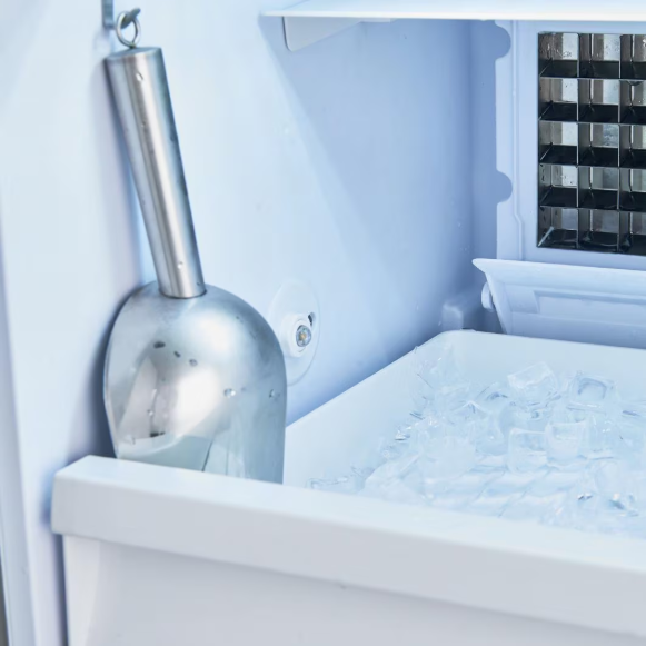 Inside, the BIM182OSADA shows can produce 60 lbs. of clear ice cubes ice daily. The intuitive control panel ensures ease of use. An indicator light alerts users to each step in the production process and when the bin is full. The interior features UV lighting for easy visibility and added protection against bacteria. The automatic defrost system minimizes user maintenance. This model has an internal pump and ships with a drain hose, water hose, removable ice bucket, and ice scoop. The interior wall includes a hook to hang the scoop for added convenience.
