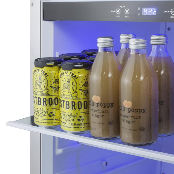 Inside, the SPR55OSADA has a digital control panel that allows you to manage the unit’s temperature with ease. An adjustable temperature range between 36 and 46°F ensures contents are kept cold. The warming drawer has a range between 80 and 200F. Three easy-glide glass shelves that extend 50% provide flexible storage, and the shelving brake system keeps unit contents safe when loading and unloading. Two-door racks are ideal for keeping condiments within easy reach, while the slotted floor ensures easy storage of bottles. The dimmable soft LED lighting in a gentle blue hue with three brightness settings offers an attractive and efficient presentation inside the white interior.