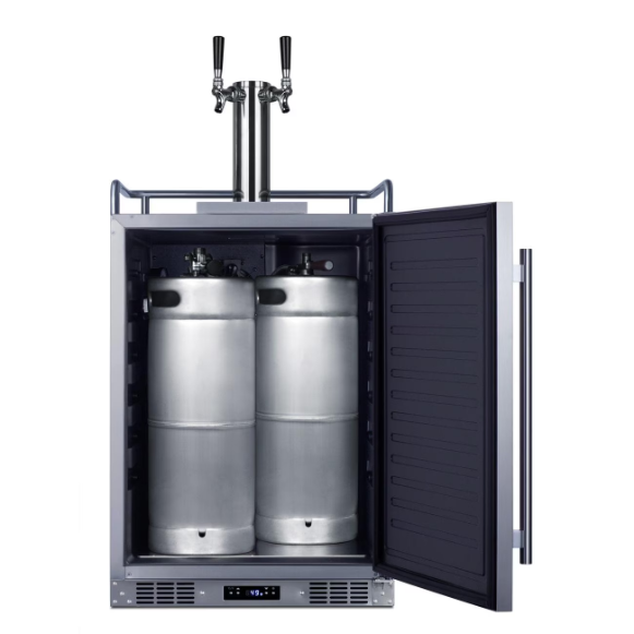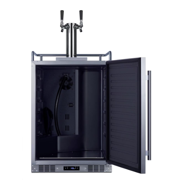The Summit SBC682WKDTWIN is a full-sized wine kegerator that can be used indoors or outdoors. It is ETL-S listed to NSF-7 and meets UL-471 standards for use in commercial establishments. Sized at just 24 inches wide, it features a weatherproof 304 grade exterior for long-lasting durability safe for use in outdoor settings. The front-breathing system allows built-in installation, while the fully finished cabinet and included caster set make for easy freestanding, portable use. This unit features a user-reversible stainless-steel door with a pro style vertically mounted handle. The sealed back allows for easy cleaning of the unit. Additional features include a removable two-piece stainless steel drip tray to collect spills and a chrome guard rail to help keep glasses in place.