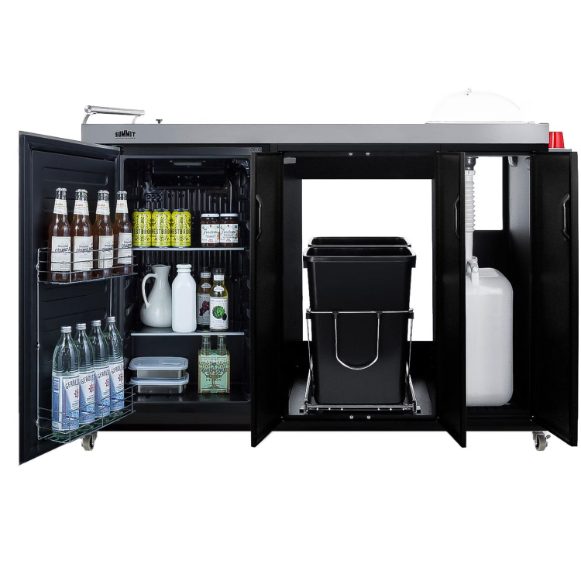 Bring new convenience to outdoor entertainment with Summit’s fully featured selection of mobile outdoor kitchenettes. Model CK54OSRS is a 58 inch wide mobile cart that comes fully featured for backyard entertaining. We include our popular ENERGY STAR certified all-refrigerator (model CK54OSRS) for efficient, weatherproof storage of food and beverages. The refrigerator features a stainless steel door complete with a front lock, allowing you to secure items when not in use. Next to the refrigerator, two jet black cabinet doors protect your full-extension slide-out waste receptacle. We include two trash bins. We include two plastic bins that fit perfectly inside. The stainless steel work surface offers plenty of room for mixing beverages or prepping your party. A recessed cutout features a removable cutlery tray that can be covered with our durable cutting board, letting you maximize useful counter space. The right side includes a sink compartment that can be connected to your garden hose to dispense cold water. We also include a removable clear dome that covers your sink, allowing you to create your own ice bucket system to keep items chilled and protected from pests. We supply a waste drain bottle that can easily be installed under the sink area and emptied as needed. For smooth portability, the CK54OSRS is equipped with four heavy duty caster wheels (front two are locking) and a stainless steel towel bar handle for easy steering. A stainless steel speed rail is installed on the right side for convenient dry storage. This unit is constructed from stainless steel and powder-coated metal. We include a vinyl cover to help protect the unit from the elements when not in use.