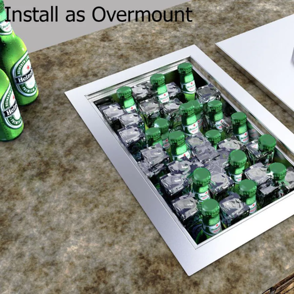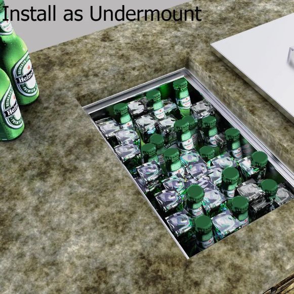 Sunstone island components provide the complete professional solution for outdoor kitchen builders at an affordable price. Be the envy of your neighborhood with Sunstone full line of outdoor kitchen and island accessories. This Sunstone Dual Mount 14-Inch Ice Bin can be installed as either drop-in or under mount on counters up to 2 3/8 inch thick with all necessary hardware. Includes the drain and a sturdy cover constructed entire out of 16 gauge stainless steel. The zero radius rectangle design with 90 degree angles adds a modern sleek style to your outdoor kitchen. The extra deep basin holds beer bottles standing up-right and is constructed with 20 gauge stainless steel and is packed with nearly an inch of insulation that will keep your ice or beverages cold. This ice bin is constructed out of 304 stainless steel for lasting durability.