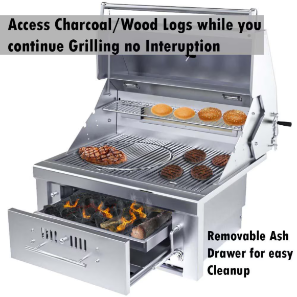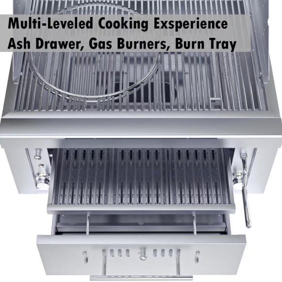 The Sunstone 30 Inch Gas/Charcoal/Wood Hybrid offers you a complete grilling solution with integrated Dual Gas Combined 30,000 BTU Burners with Electronic Ignition System under the main Charcoal/Wood Drawer and coupled with the Charcoal & Wood Burning Drawer! Easily replenish Charcoal or Wood type while you continue grilling then remove the whole drawer for easy clean-up, dumping ash waste away. Unlimited ways to grill, Smoke, and Sear with multiple ways to customize the drawer systems, the height adjustable top tray can be loaded with your choice of whole wood pieces like mesquite, or oak – giving your food an added flavorful experience. Use one side for High Heat Sear Grilling, while the other side is Low Heat Indirect Cooking – and Re-Ignite the Charcoal/Wood in the Burn Trays as Needed or use the Gas Burners alone with Up To 500 degrees of heat from just the bottom burners, adding Charcoal or Wood increases this exponentially. Use the 15,000 BTU Infra-Red Burner as an additional pass-over Searing, or Dual Height Rotisserie Function and use up to Two Rotisserie Rods Simultaneously. Swap into the grill multiple inserts like Pizza Stone, Deep Fryer, Griddle, and Searing for over 800 degrees of heat at the grilling surface. All Construction Materials & Components are made with Solid 304 Stainless Steel – Engineered and Designed Exclusively in the USA, A Proud Texas Company where Exceptional Quality meets Exponential Grilling Performance. Configured for Natural Gas.