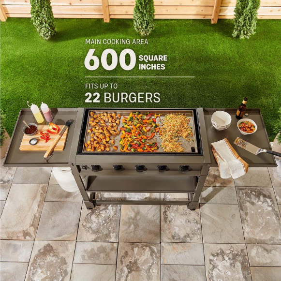 Level up your grilling game with the TYTUS Anaheim 36 inch 5-Burner Griddle – the ultimate flat-top cooking experience. A recessed 4.5 mm oil-coated carbon steel griddle plate delivers excellent heat distribution and reduces spills. Five cook zones across 600 square inches of cooking space go from high heat searing to low temperature cooking with the turn of a dial, so you can cook up delicious bacon & eggs, burgers & brats or surf & turf, all from the comfort of your back yard. Fast, no-tool assembly with the included cover, spatulas, oil squeeze bottles, and scraper give you everything you need to get cooking within minutes of opening the box.
