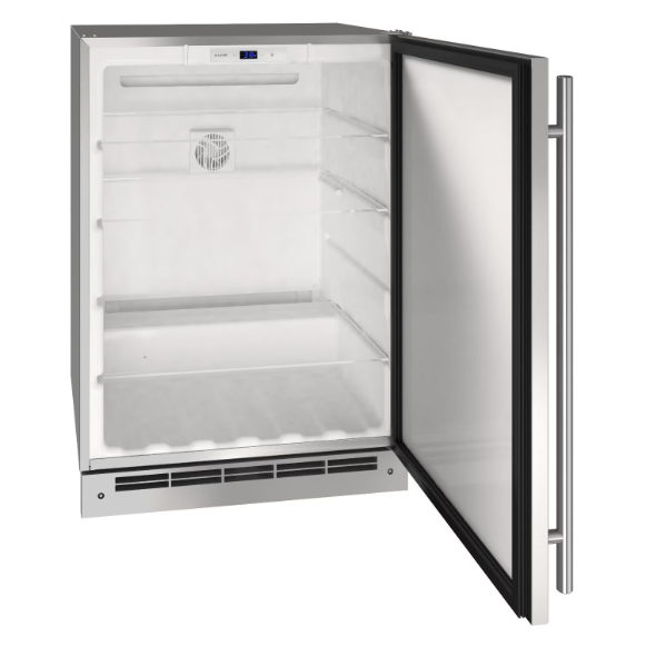 The Outdoor Series by U-Line provides unparalleled refrigeration for outdoor kitchens and other applications. The UORE124-SS01A refrigerator features 5.4 cubic feet of volume and holds up to 117 12-ounce bottles or 194 12-ounce cans. Enjoy the digital passive cooling system with convenient 3 button touch pad control with blue LED display to manage your items between temperatures of 34 to 60 degrees Fahrenheit. Your selection is illuminated under white LED lighting on three removable, tempered glass shelves. Choose to which side you open the unit with the field reversible door and adjust the height with the leveling legs for a precise under counter fit. This UL outdoor qualified unit is designed to be built-in and can be converted for freestanding use with the optional U-FSK-S stainless steel freestanding conversion kit (conversion kit sold separately).