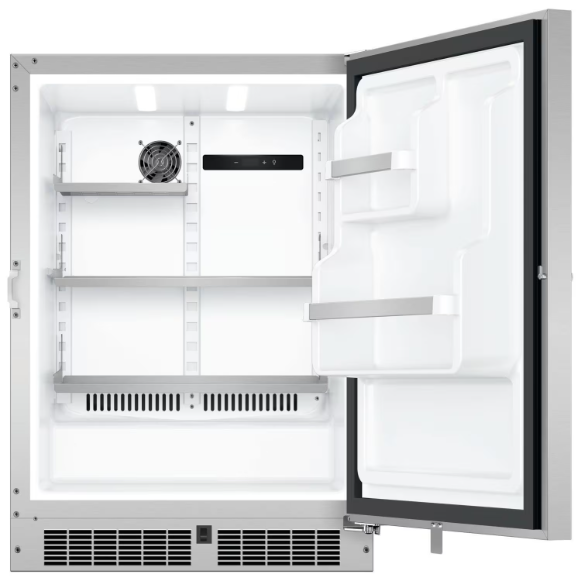 The DCS 24-Inch right-hinged outdoor refrigerator is the perfect addition to your outdoor kitchen area. With 5.3 cubic feet of storage, it is capable of holding up to 154 12-oz cans. The rapid cool-down technology and precise temperature stability will help keep your favorite beverages or snacks cool. This compact refrigerator is constructed of 304 stainless steel and is UL-approved, making it ideal for outdoor use. It includes an automatic interior light and a temperature range of 34°F to 60°F. An audible alarm indicates if the interior temperature falls outside of the proper storage parameters or if the door is left ajar. This compact refrigerator can be used in either freestanding or built-in applications.