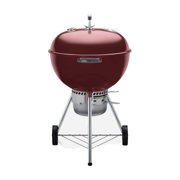 Experience the charcoal revolution that started it all with a Weber kettle-style BBQ grill! Weber kettles combine traditional, iconic design with innovation in production and versatility. Made of premium-grade U. S. Steel coated with porcelain enamel inside and out, the bowl and lid of the Weber Original Premium charcoal grill are precisely formed to allow heat to circulate evenly inside the grill and across the 363 square inches of cooking area. The crimson porcelain-enamel coating is baked on, fusing the finish to the steel to prevent rusting and peeling through years of use. The aluminized steel One-Touch cleaning system makes clean-up hassle free. As you rotate the handle, three blades in the bowl move ash through the vents and down into the removable, high-capacity aluminum ash catcher below, which is enclosed to prevent ashes from blowing away and creating a mess. Only the unburned coals remain in the bowl and can be re-lit for your next barbecue, which helps you save money on fuel. The adjustable, no-rust aluminum top vent provides the proper airflow needed for perfect grilling and, along with the built-in thermometer, helps you to control the temperature inside the grill. Weber Original Premium grills also feature hinged plated steel cooking grates for easily adding more charcoal. In addition, this grill includes three glass-reinforced nylon handles that will withstand the elements for the life of the grill, two of which have built-in tool hooks, and a hook that conveniently allows you to hang the lid on the bowl while you grill. Aluminum legs elevate the grill to an ideal height for grilling. This Weber grill also includes two, virtually indestrucible all-weather wheels that make moving the grill easy. A classic, dependable design, the Weber Original Premium Kettle charcoal grill is engineered with the backyard griller in mind!