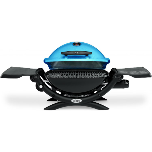 Ready, set, grill on the go! The Weber Q 1200 portable gas BBQ grill offers 189 square inches of cooking space to create the grilled foods you love anytime, anywhere. Weber Q gas grills are perfect for tailgating, camping or small spaces like apartment balconies. With the push of a button, the grill ignites quickly and easily. The durable stainless steel burner produces 8,500 BTUs and the infinite control burner valve allows you to set it to the precise temperature you need with an easy-to-use knob. This Weber portable gas grill features two folding work tables so you have space to spread out, each with convenient tool hooks. It also features a tall cast aluminum lid which is designed to expand your grilling area for larger items. The Weber Q 1200 also features a built-in lid thermometer and a two-piece, porcelain-enameled cast iron cooking grate that heats evenly across its surface. It also features a blue lid, cast aluminum body with drip ducts and a sturdy glass-reinforced nylon frame and handles. A removable grease catch pan is included to make clean-up easy. This Weber Q operates on a 1 pound disposable propane cylinder (not included). An optional 20-lb tank adapter hose is available as an accessory for those times you need to feed larger groups. Weber Q recipe booklet is included.