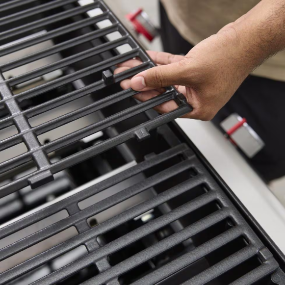 • Porcelain-enameled, cast-iron cooking grates retain even heat
